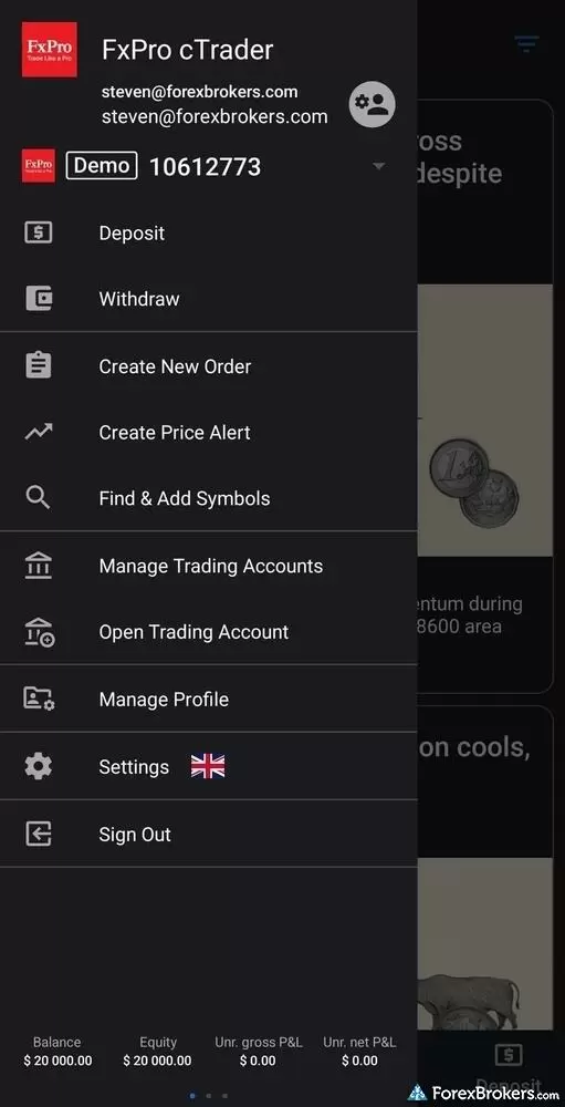 Ease of use: FxPro Direct is FxPro's proprietary mobile app, which supports trading for users that have a CFD account, and has evolved from being initially optimized for account management into a modern day trading app. It features basic charts and and other features found in the web version. The FxPro Edge platform is available for mobile (though I was not able to install it due to a country restriction in the Google Play store). Overall, FxPro offers four mobile apps for you to choose from, including MT4, MT5, cTrader, and its flagship FxPro Edge app.